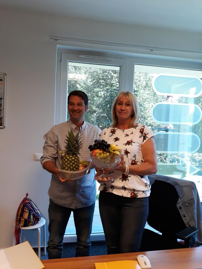 Az ünnepség végén Kovács Szilveszter Grassroots Igazgató adta át azt a díszes gyümölcstálat, amit a veterán labdarúgók ajándékoztak Petrika Ibolyának.